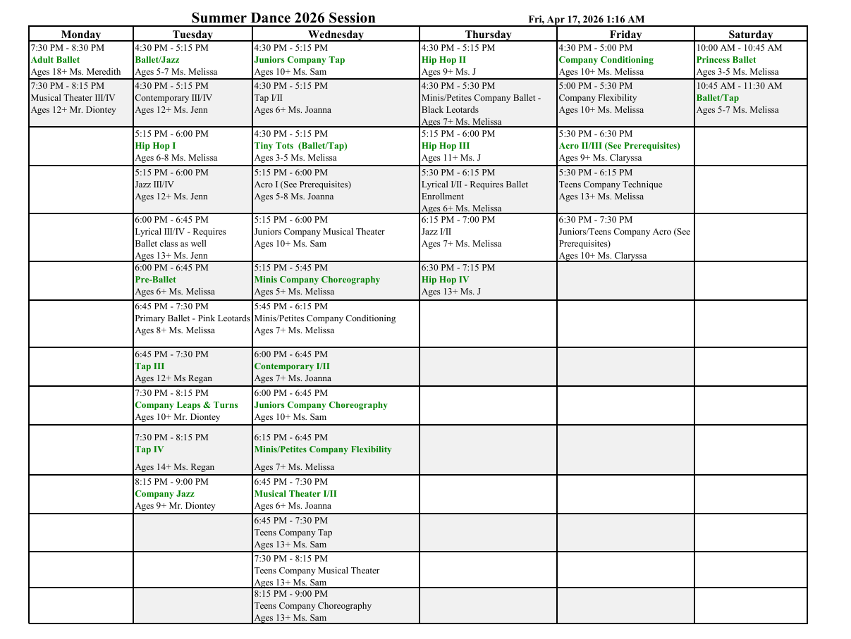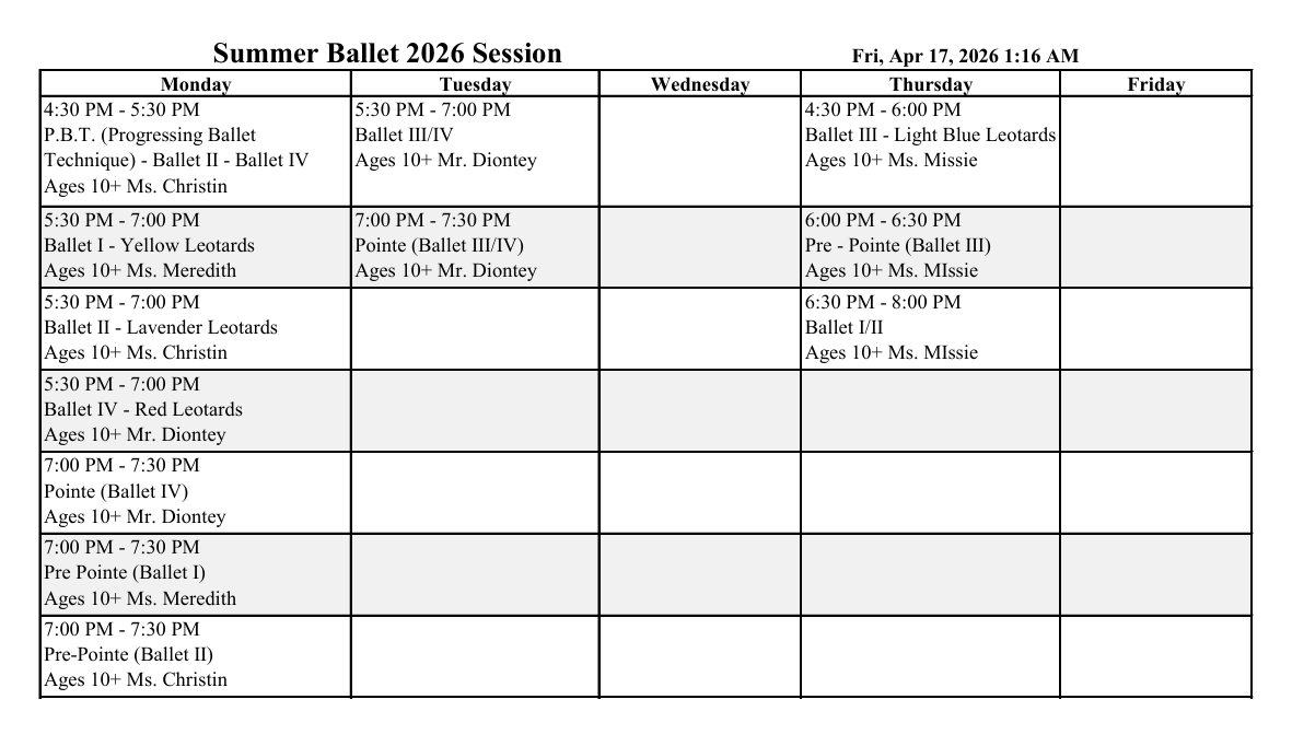 A PDF version of the Summer Dance Schedule can be found here. A PDF version of the Summer Ballet Schedule can be found here.